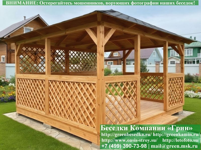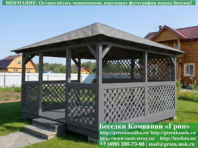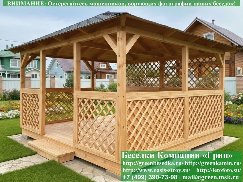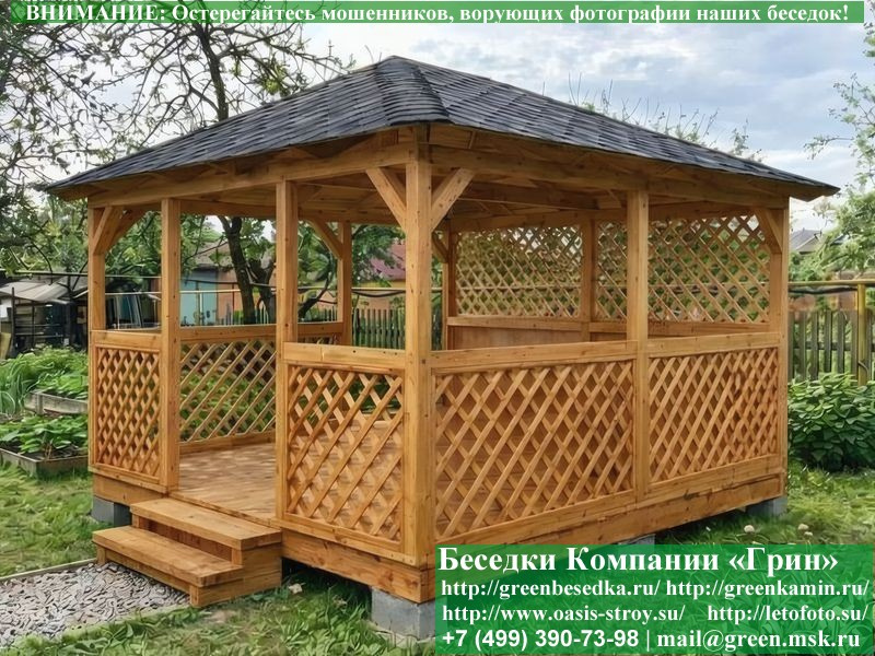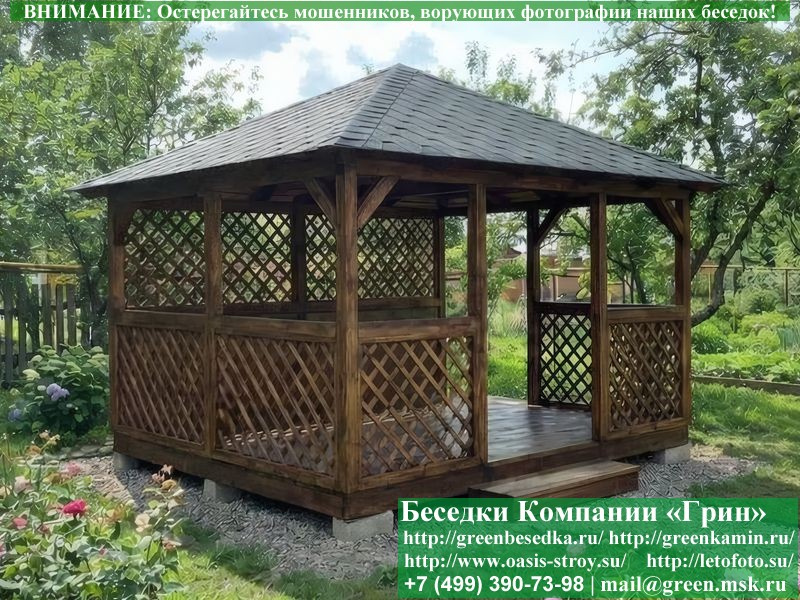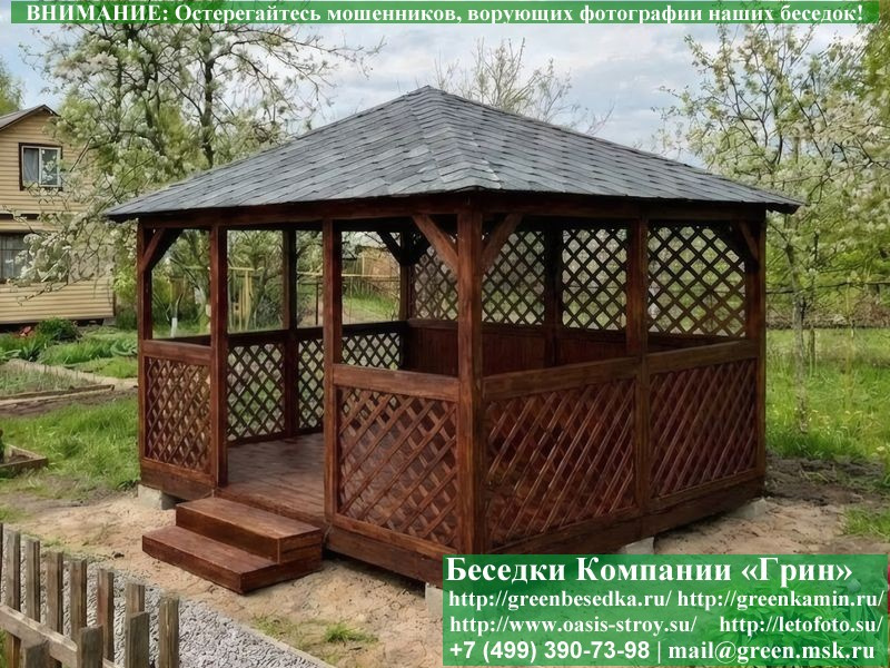 Летняя беседка размерами 4х4 метра изготавливается из сосны, со сплошной одноярусной (вальмовой) крышей. При строительстве беседок используется сухой материал камерной сушки. В качестве несущих стоек используется строганый брус 90х90 мм.  Открытые стенки можно закрыть перголой (решеткой). На крышу укладывается мягкая черепица "Технониколь": Коричневых, Зеленых, Бордовых, Серых цветов. Срок изготовления и установки беседки на участке составляет 7-10 дней. Беседки поставляются в не крашеном виде. Возможна покраска беседок или обработка антисептиком.
