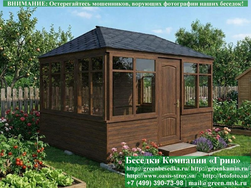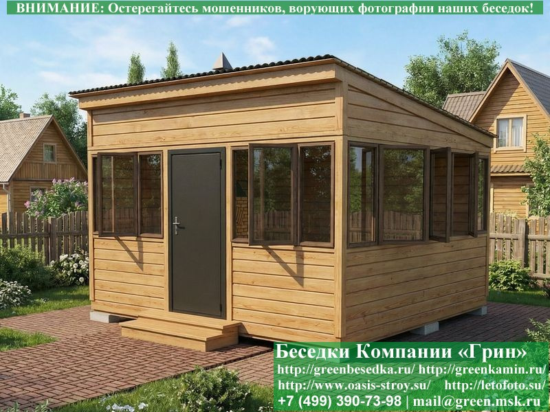 Застекленная беседка 4х4 метра изготавливается из сосны, по специальной каркасной технологии. При строительстве беседок используется сухой материал камерной сушки. В качестве каркаса используется очень надежная имитация бруса имитация бруса 17х140 мм