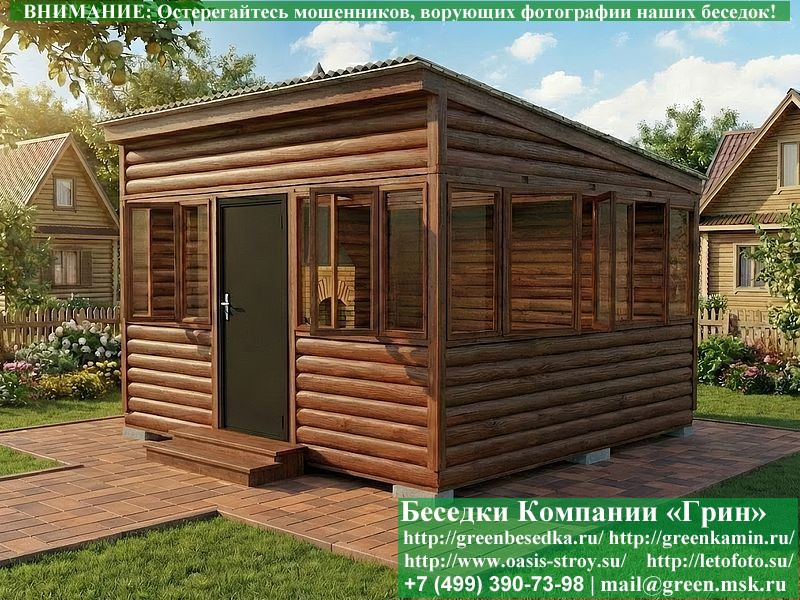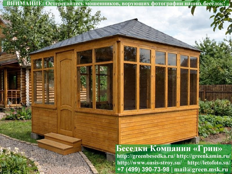 . В отличие от вагонки она не гнется, не набухает и не идет трещинами. Используется усиленная конструкция крепления стенок. В качестве несущих стоек используется строганый брус, по углам 90х90 мм. В качестве пола используется фактурная строганая доска 35 мм. Срок изготовления и установки беседки на участке составляет 5-10 дней. В весенне-летний период срок может немного увеличится. Беседки поставляются в не крашеном виде. Возможна покраска беседок краской, лаком или обработка цветным антисептиком (дешевый вариант).